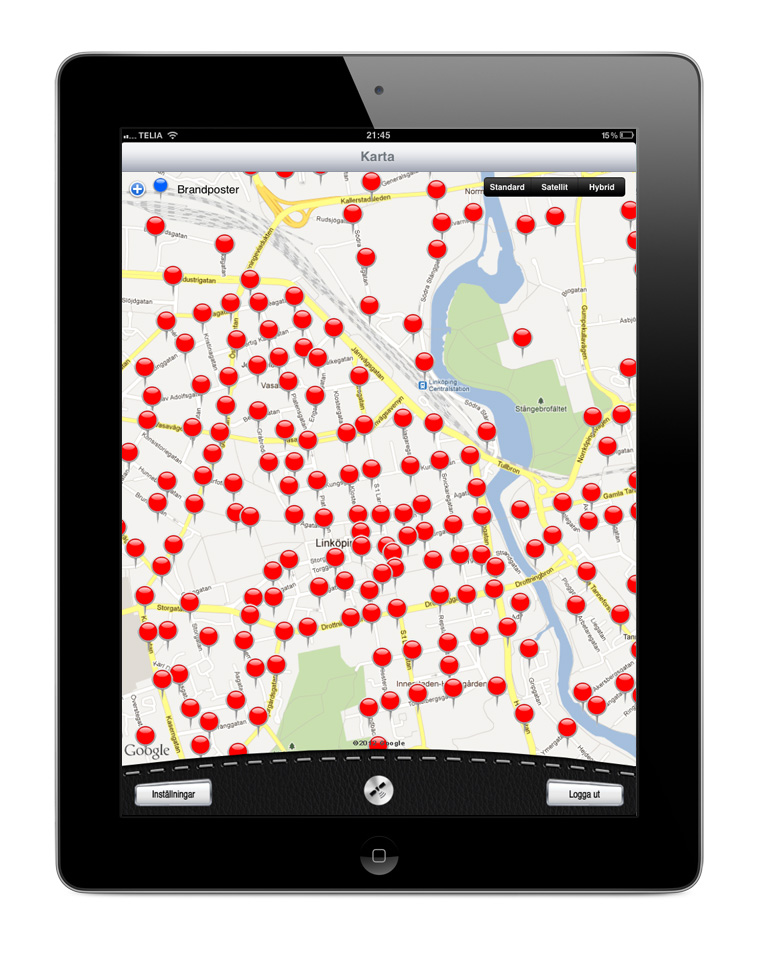 Längst ner till vänster finns en knapp som heter "Inställningar". Här inne kan du filtrera fram vad som ska visas i kartan, hantera ljud och säkerhetsinställningar samt synkronisera datan mot vår databas. |